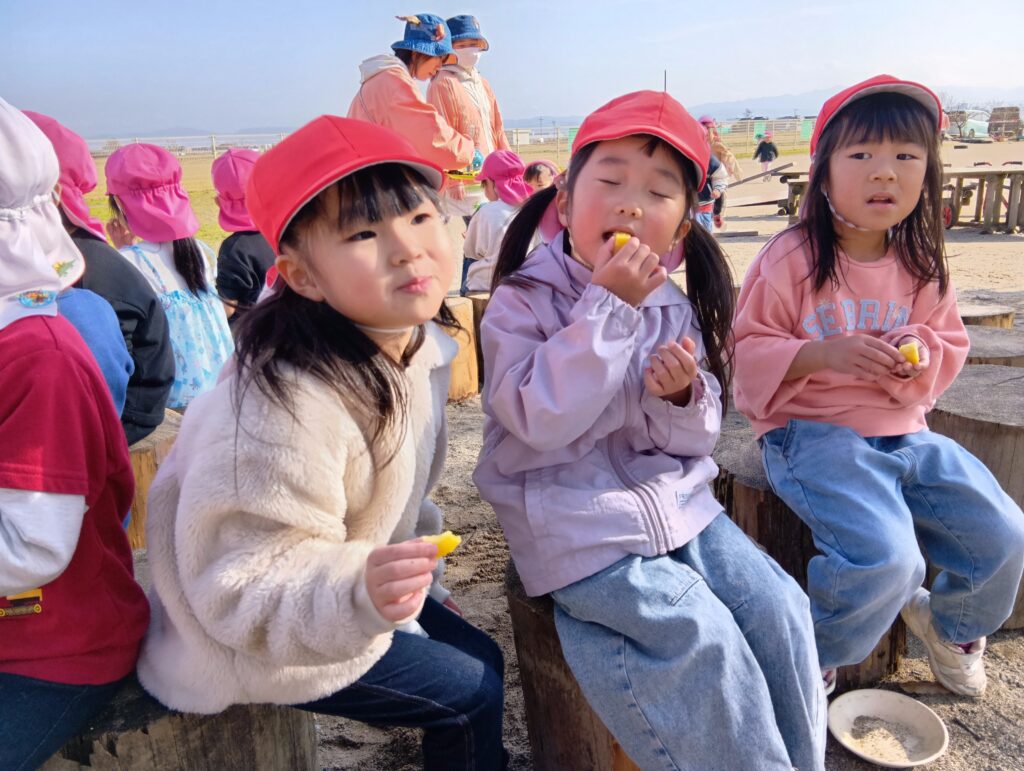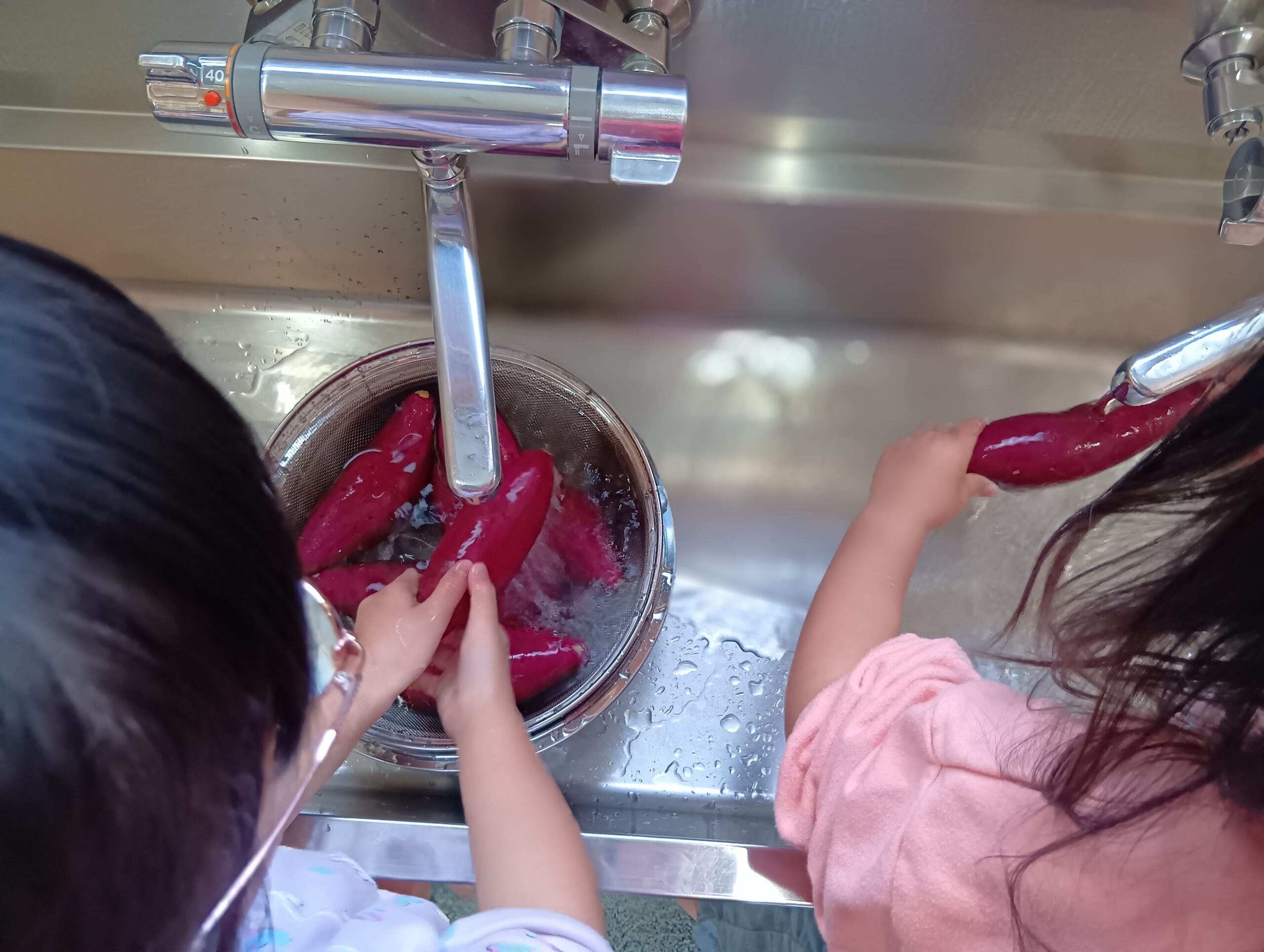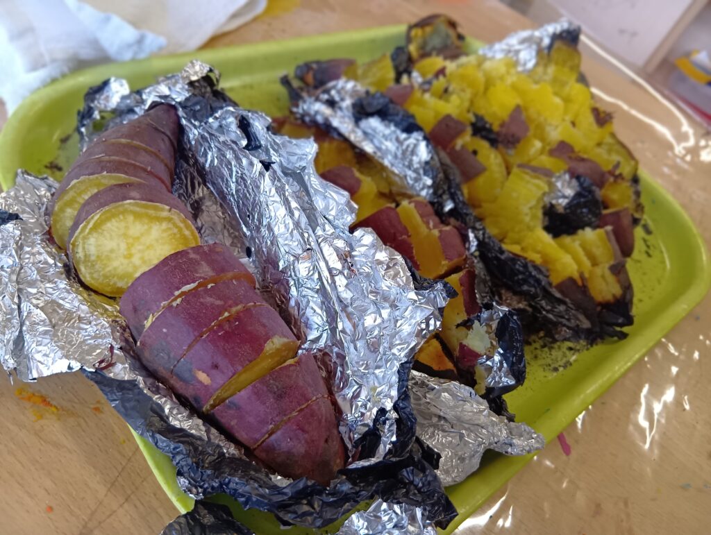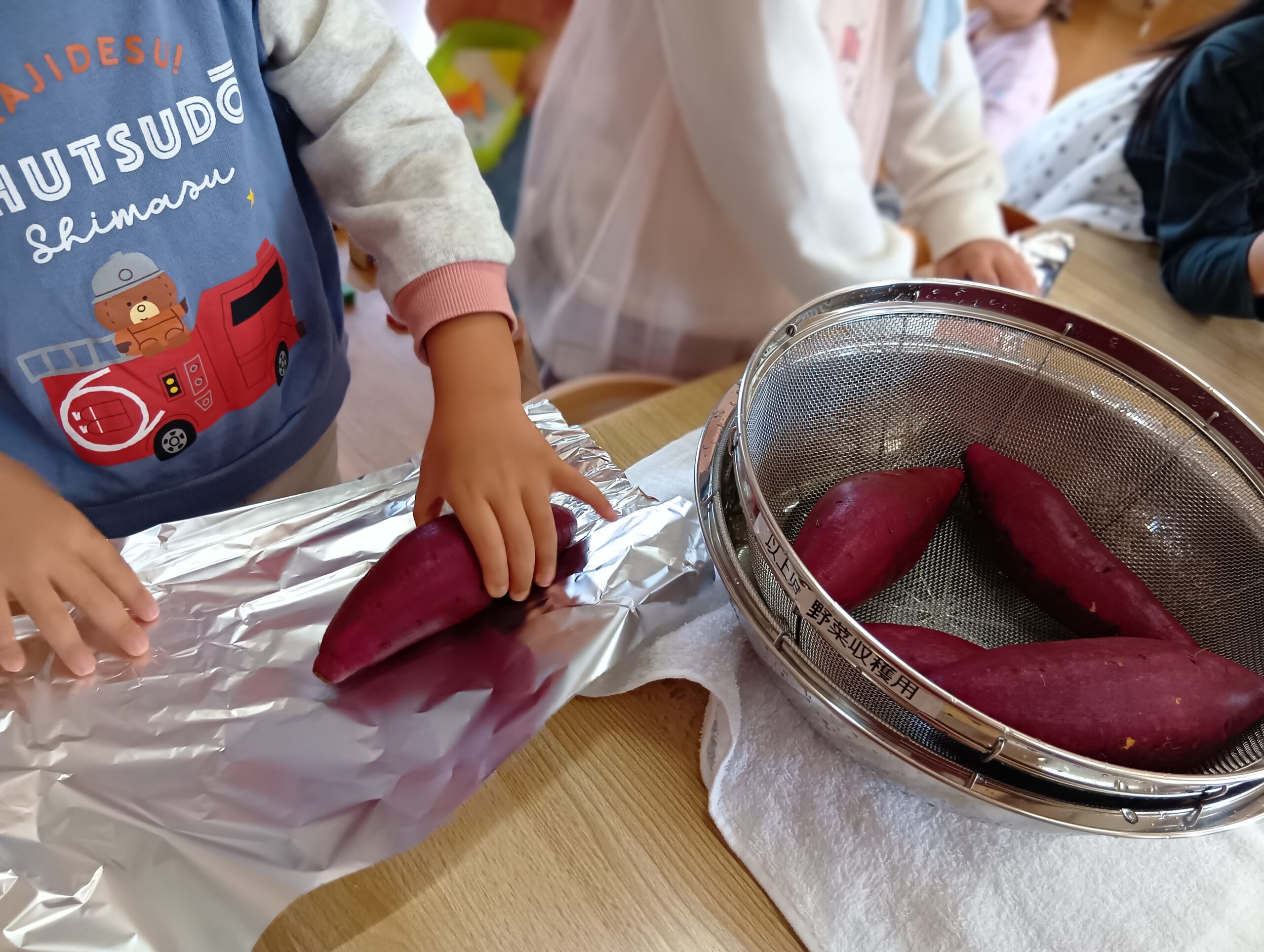 お部屋では、サツマイモの準備。 みんなで苗を植えて育て、収穫した畑のサツマイモ!