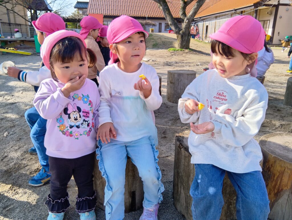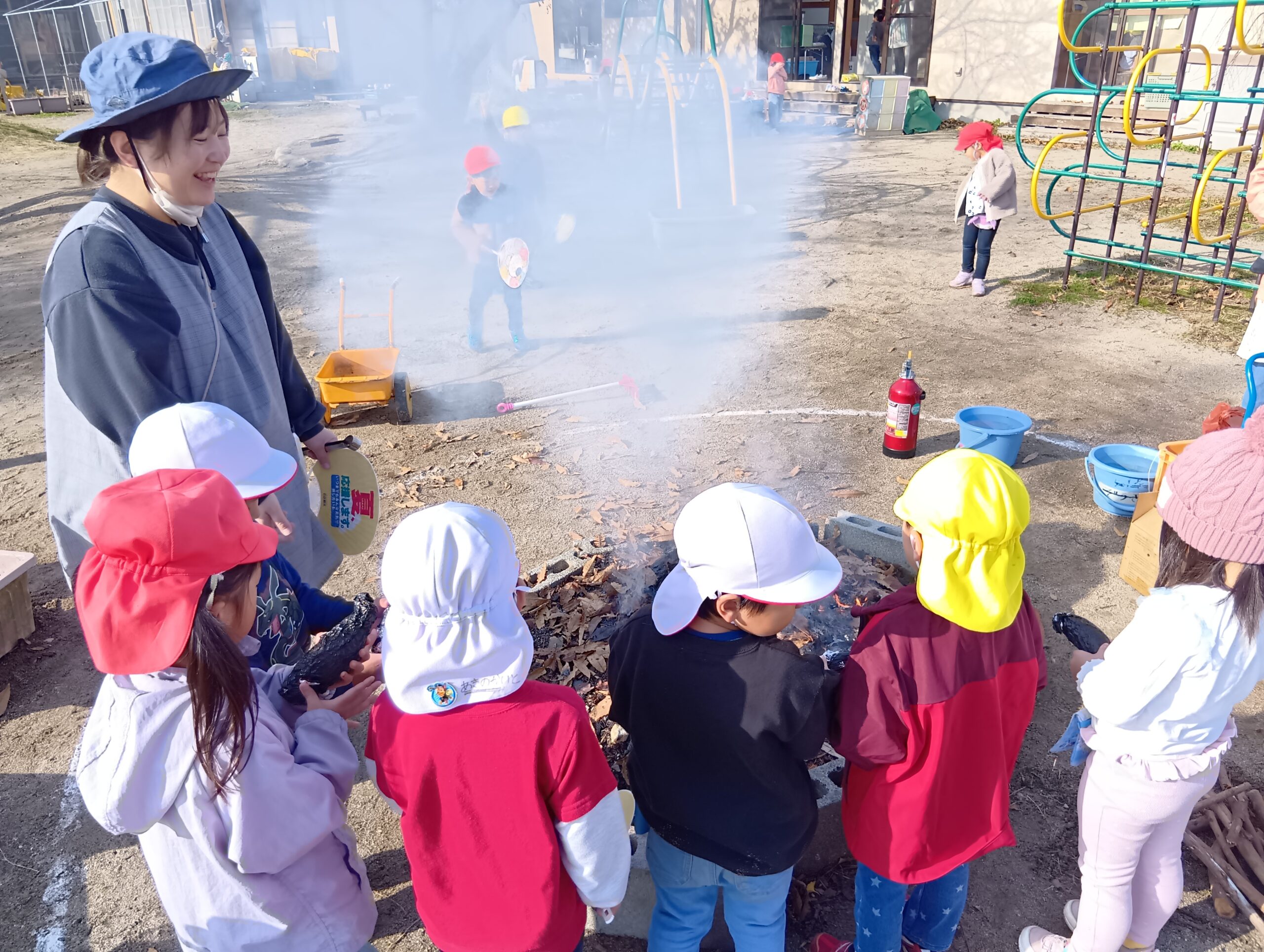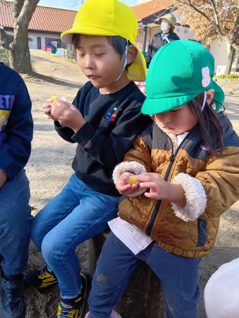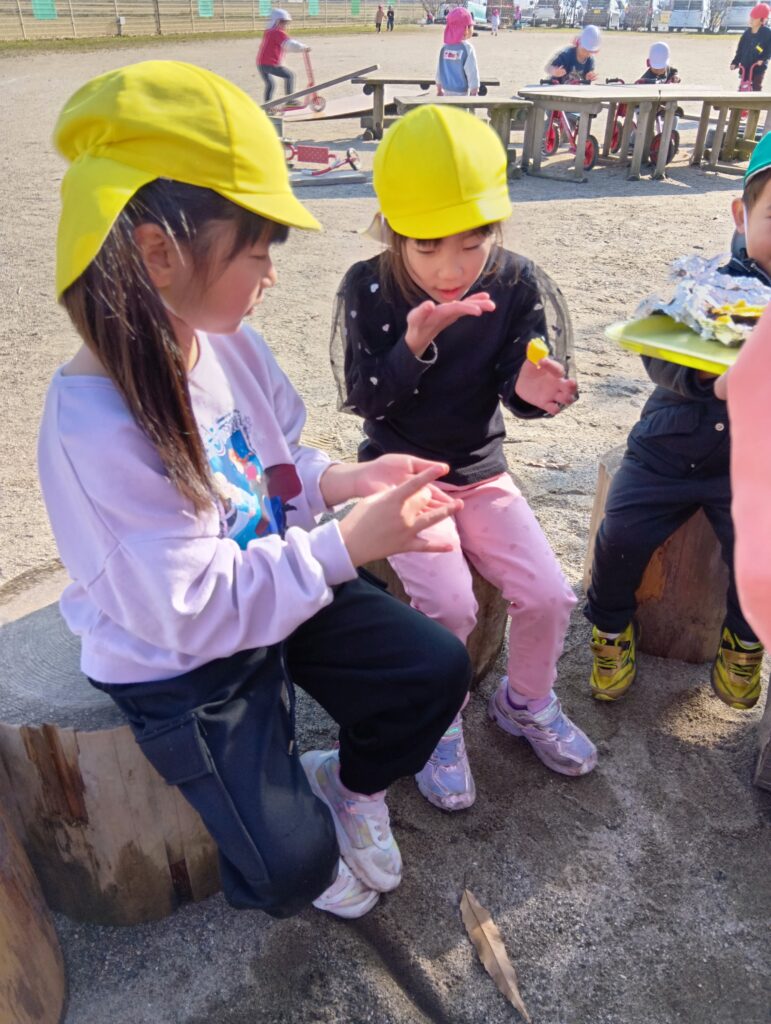 子どもたちの会話も弾みます。お庭が雪で真っ白になる前にまた焚火しようね。